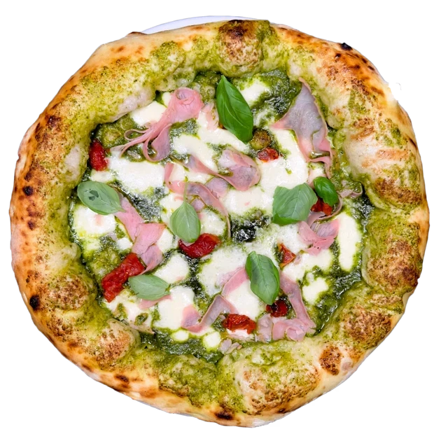 Pesto de basilic à la génoise, fior di latte de Agerola, jambon cuit, tomates séchées, huile EVO aromatisée au citron