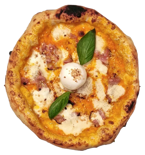 Fior di latte de Agerola, Crème de courge, Stracciatella fumée, Guanciale, Basilic, Huile EVO