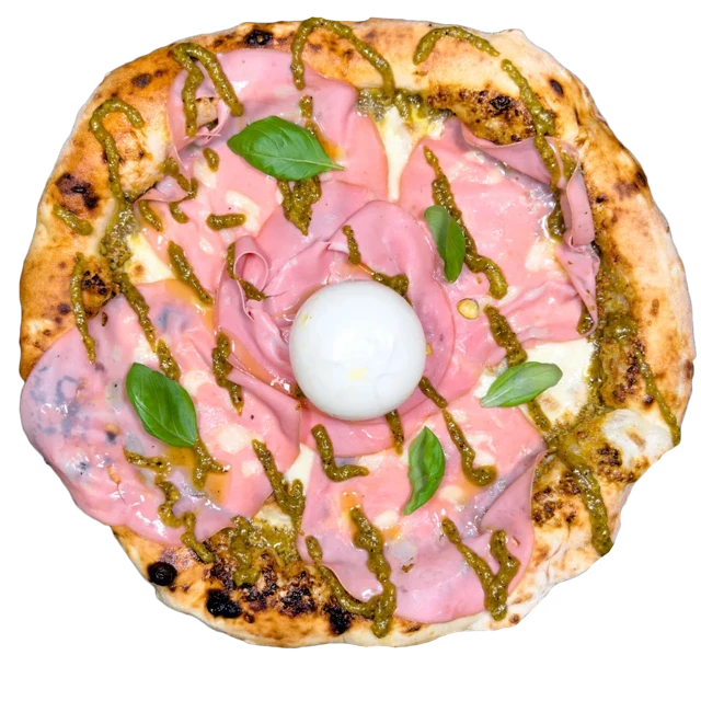 Pesto de pistache, mortadelle IGP, burrata, pistaches concassées, basilic, huile EVO de Puglia