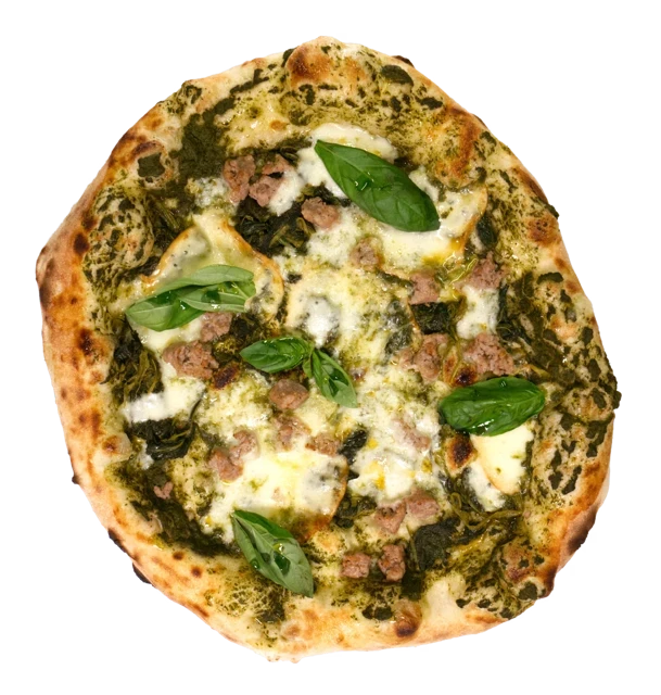Crème de friarielli, fior di latte di Agerola, saucisse fraîche, friarielli frais, provola fumée, basilic, huile EVO